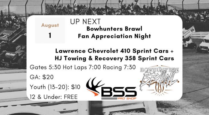 Racing will feature the Lawrence Chevrolet 410 sprint cars in the “Bowhunters Brawl” presented by the Bowhunters Superstore and the HJ Towing & Recovery 358 sprints while general admission fans get a chance to visit the backstretch pit area.